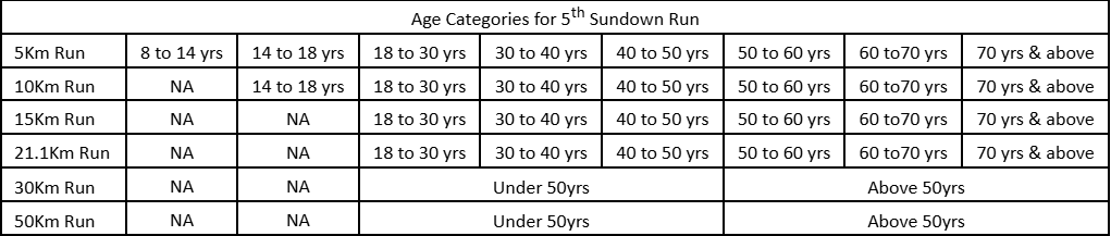 Age Categories for 5th Sundown Run