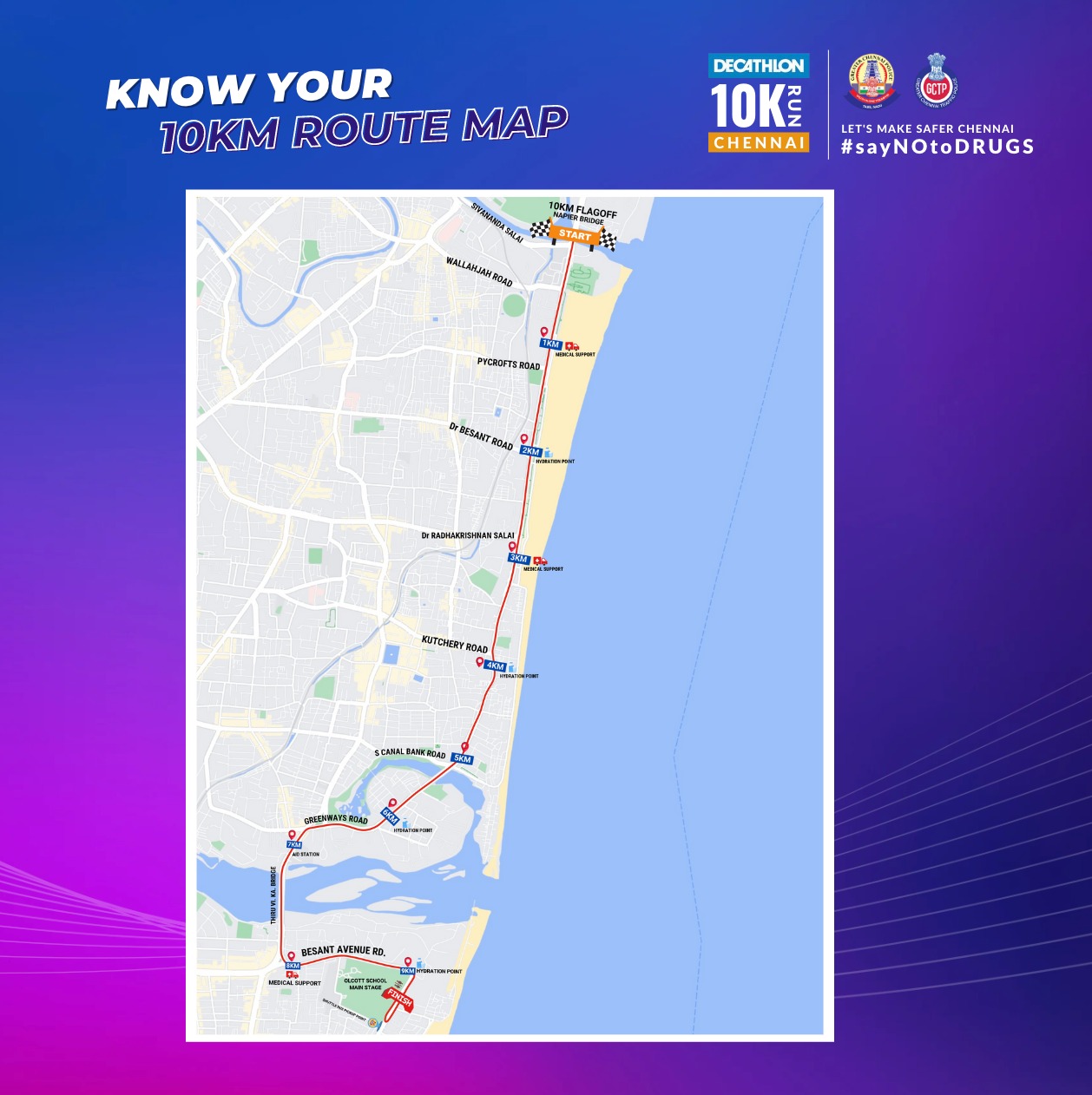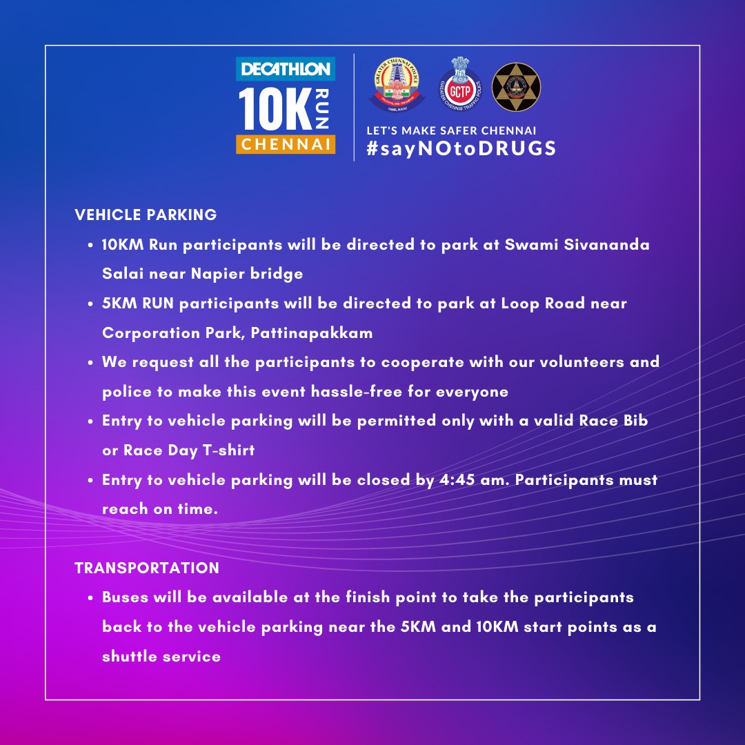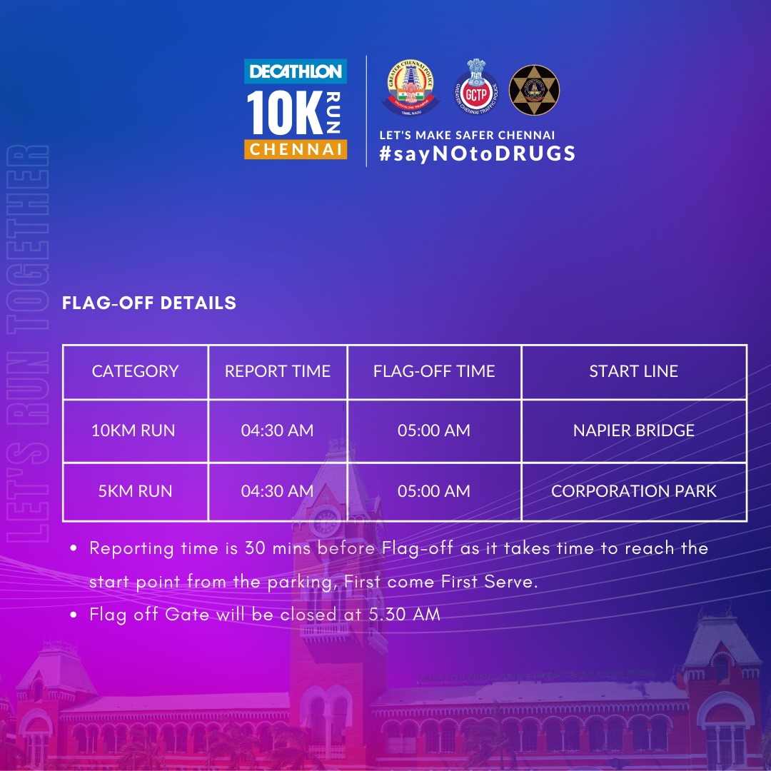 "Decathlon 10K Run" is happening for the first time in Chennai in collaboration with the Greater Chennai Police. This is not a race, but a statement of our commitment to living a healthy, drug-free lifestyle. Participants from all over the city will come together to run through the best route....